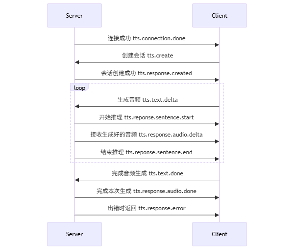 | 创建会话 | tts.create | tts.response.created | 创建会话及对应响应。收到对应响应后,可进行进一步生成。 |