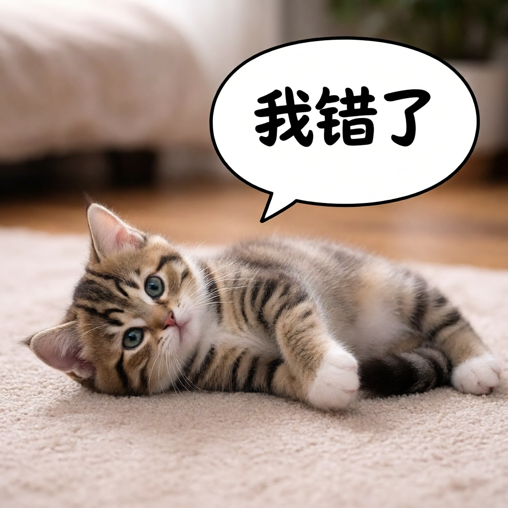 Prompt:让图中猫躺在地上露出肚皮,旁边有个对话气泡框写着”我错了”