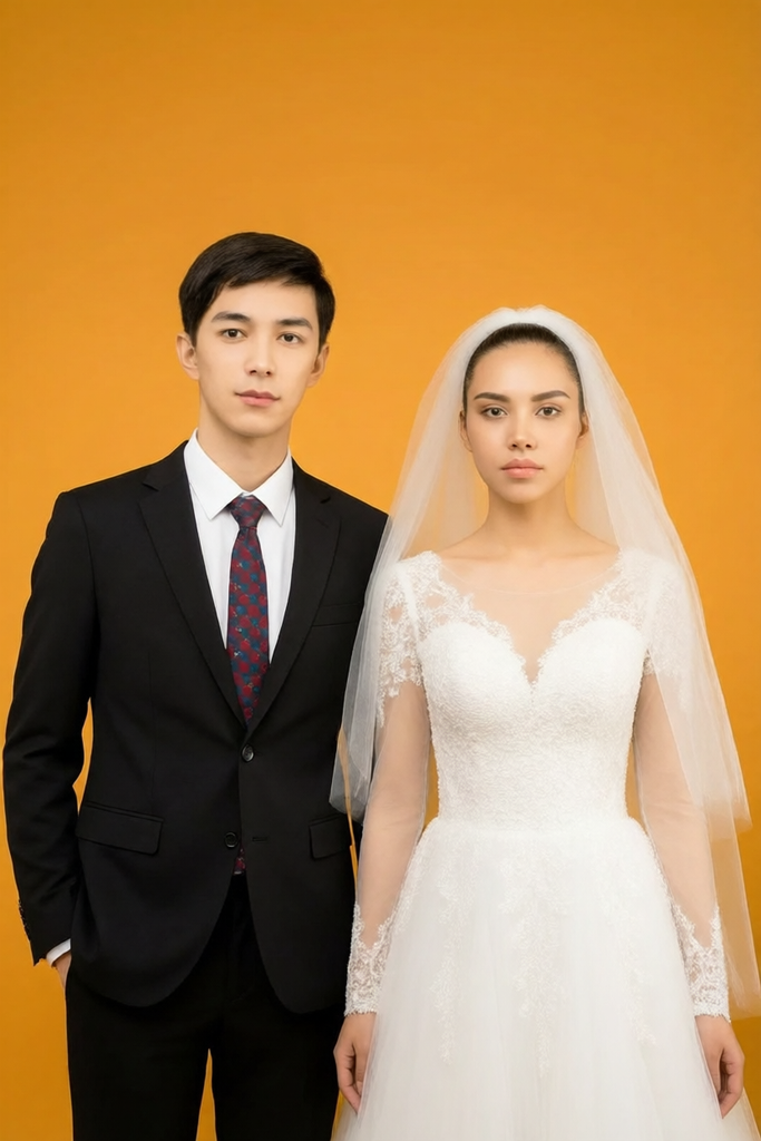 Prompt:图中男性换成西装和衬衫,女性换成一个美丽的西式婚纱,头戴纱巾,两个人同时正面面向镜头